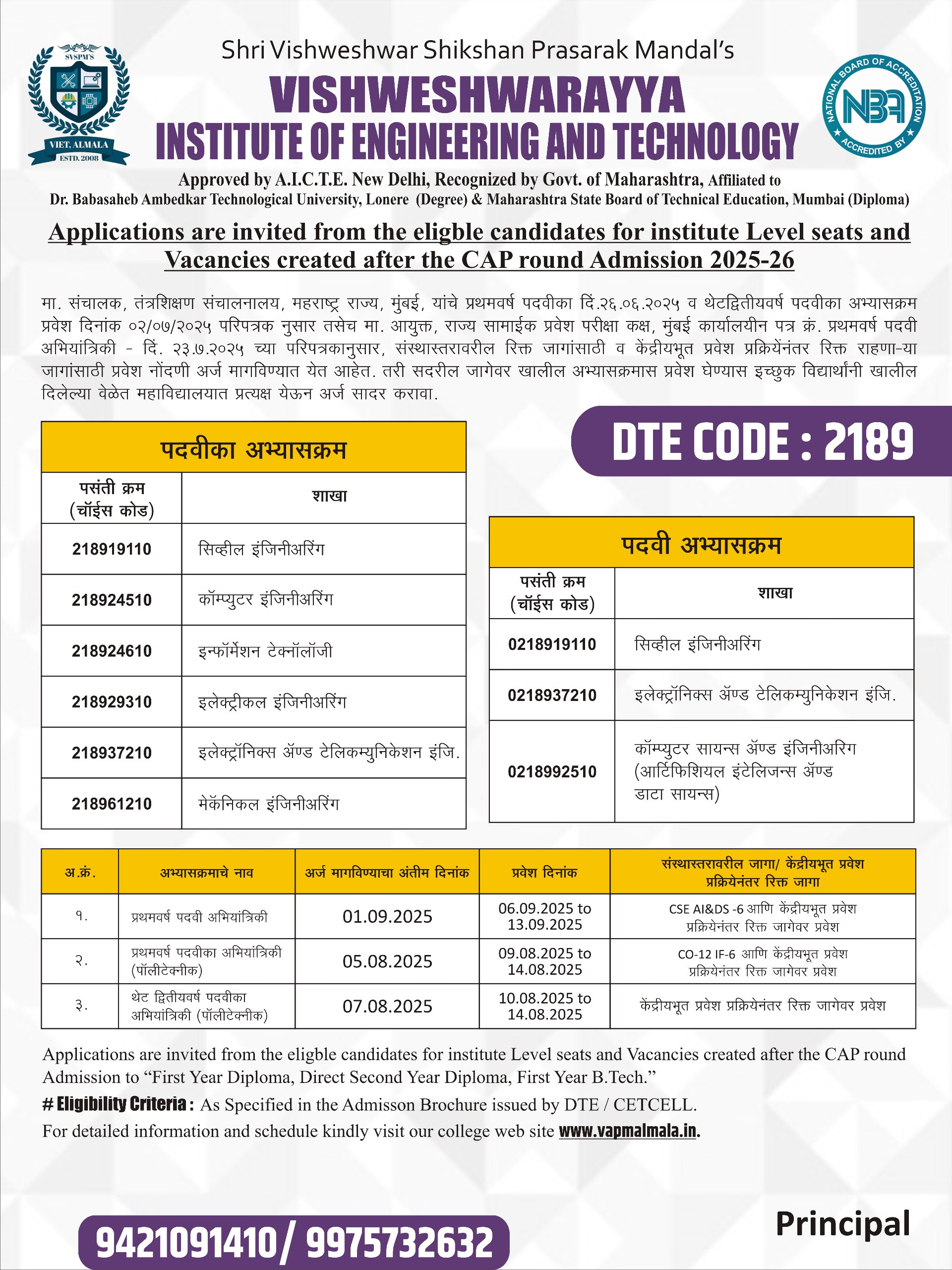 DIRECT SECOND YEAR MERIT LIST AND VACANCY FOR YEAR 2025-26