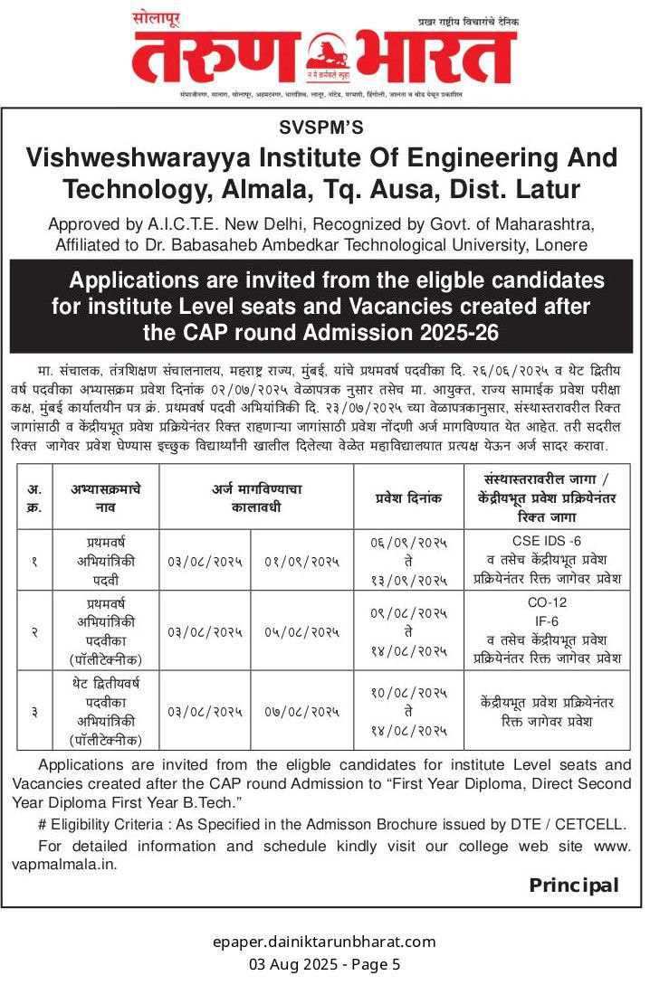 AGAINST CAP & INSTITUTE LEVEL ADMISSION ADVERTISEMENT 2025-26